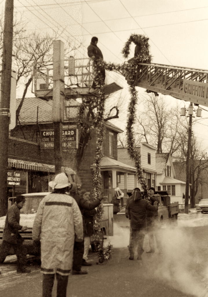 Community Spirit was organized about 1969 by Griffith resident Gale Riggle and the Griffith Junior Chamber of Commerce (Jaycees.) The reason, say the girls in their article, was “the group felt that downtown Griffith should be more festive at Christmas time.”