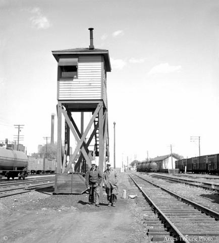 Left: Ames, IA Gate Tower, April 4, 1958ย , which looks similar to a manually operated switch tower ; Web source: https://ameshistory.org/tribunearchives/railroad-crossing-watchmen