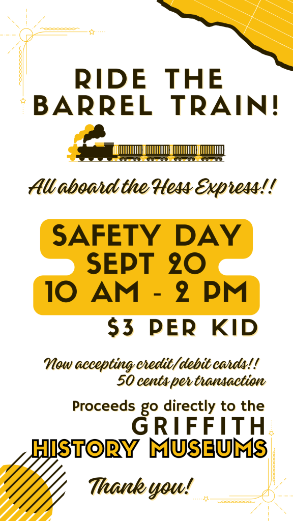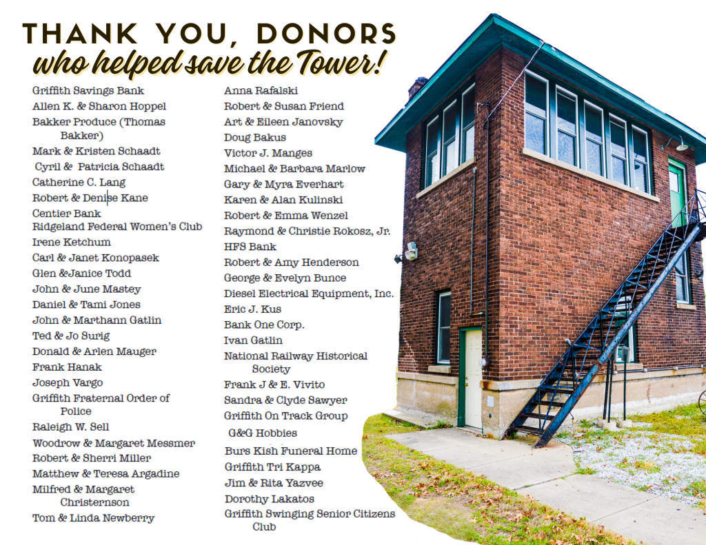 Thanks to the businesses and banks that allowed us to put donation jars on their counters, and thanks to all the Griffith residents who put money in the jars! Thanks to all the Historical Society members, who volunteered every step of the way, and of course, thank you to all the people and businesses who donated money towards this gigantic project!