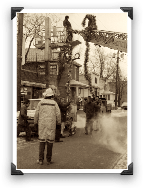 In days gone by, putting up the town’s Christmas decorations right after Thanksgiving was a yearly event in Griffith. Members of the Community Spirit organization and the Griffith Fire Department are pictured here in the 100 block of South Broad Street. Lighted garlands were strung across Broad for several blocks. It gave the town an especially festive holiday look, reminiscent, some folks said, of Bedford Falls, the town in the movie, “It’s a Wonderful Life.”
